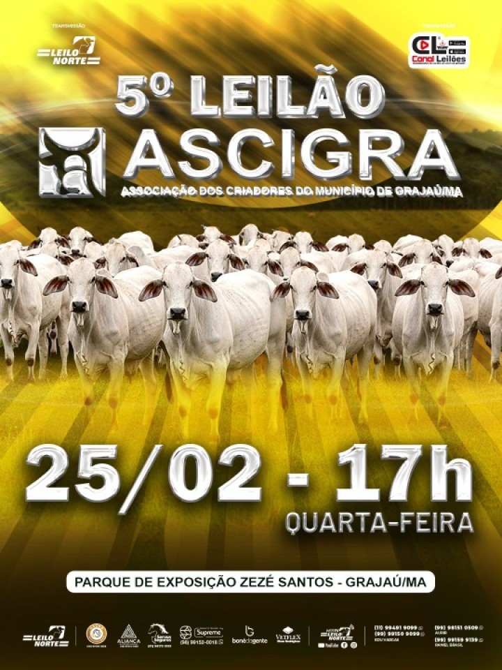 E TRANSMISSÃO AO VIVO POR INTERNET5° LEILÃO ASCIGRA - ASSOCIAÇÃO DOS CRIADORES DO MUNICÍPIO DE GRAJAÚ PARQUE DE EXPOSIÇÕES ZEZÉ SANTOS - GRAJAÚ/MA